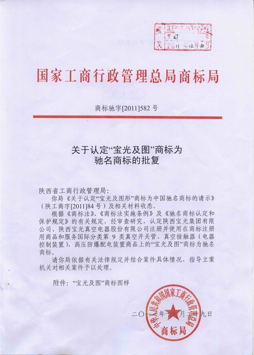 被中華人民共和國國家工商行政管理總局商標局認定為“中國馳名商標”,于2011年11月29日正式下發(fā)了《關于認定“寶光及圖”商標為馳名商標的批復》(商標馳字【2011】582號)文件)。