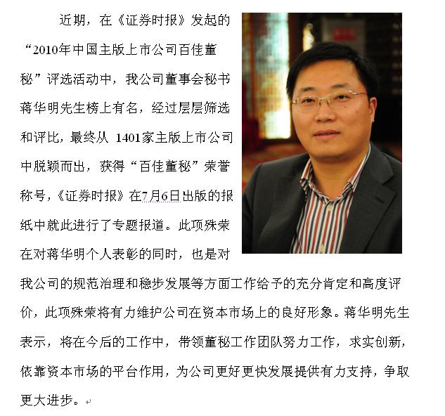 我公司董事會(huì)秘書蔣華明先生獲得“百佳董秘”榮譽(yù)稱號(hào)