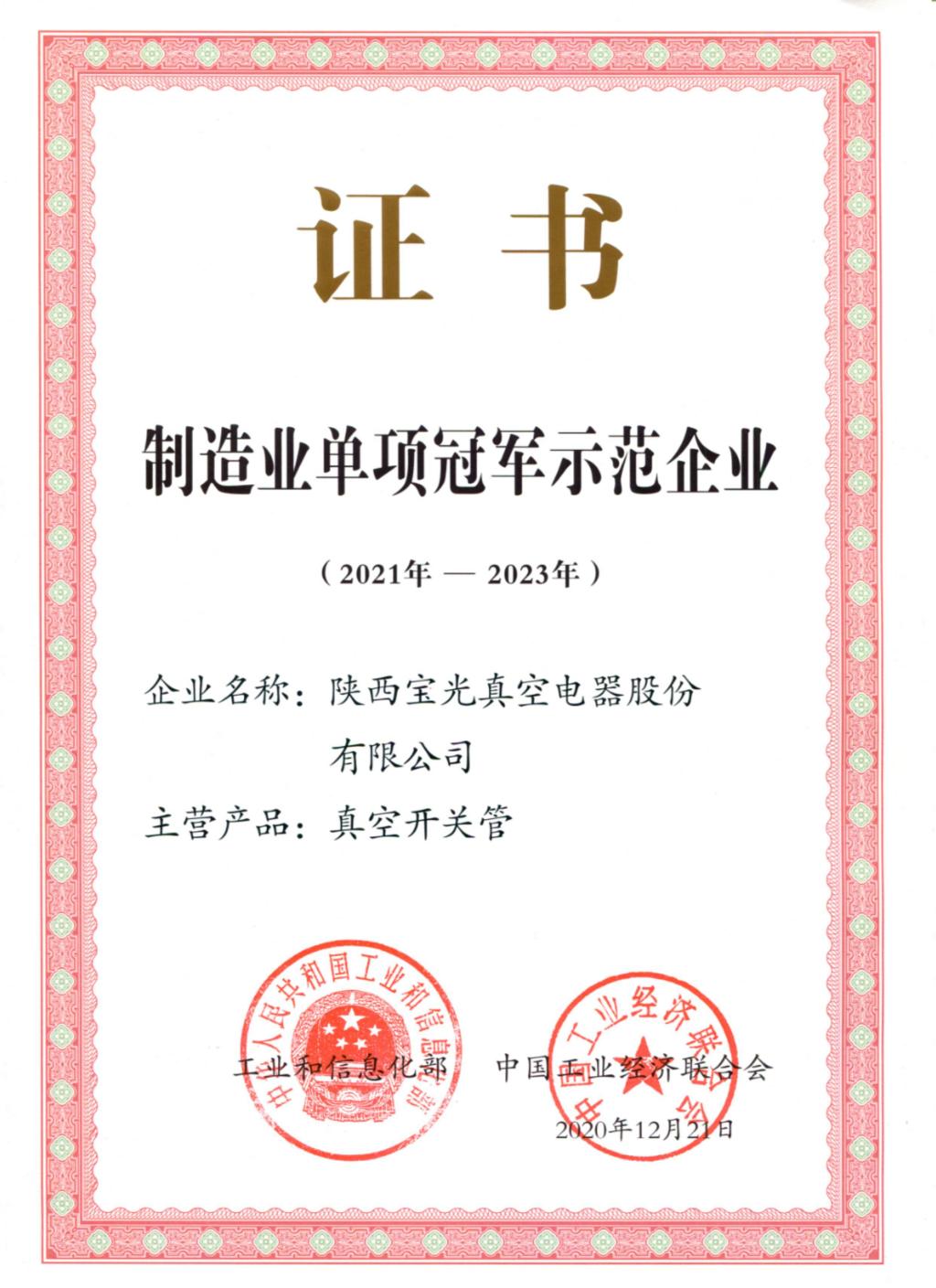 日前,陜西寶光真空電器股份有限公司(以下簡(jiǎn)稱“寶光股份”)繼2017年入選制造業(yè)單項(xiàng)冠軍后,順利通過(guò)工業(yè)和信息化部與中國(guó)工業(yè)經(jīng)濟(jì)聯(lián)合會(huì)復(fù)核,蟬聯(lián)“制造業(yè)單項(xiàng)冠軍示范企業(yè)(2021-2023)”。