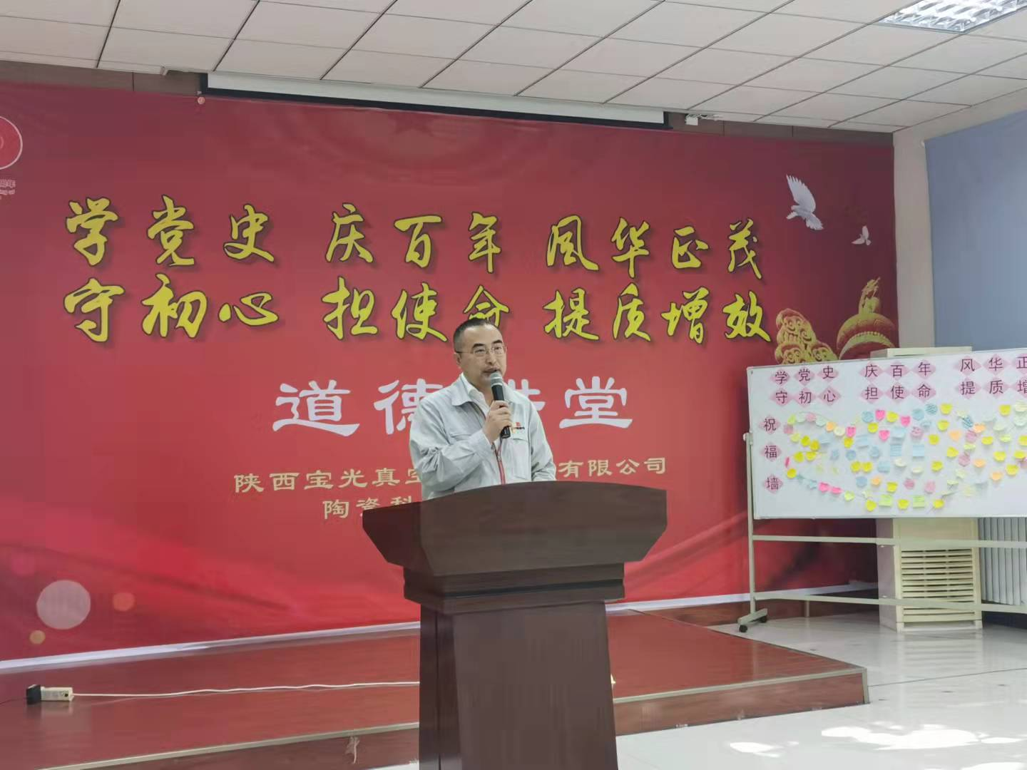 “唱支山歌給黨聽, 我把黨來比母親......”9月30日下午,在高昂激越、催人奮進(jìn)的歌聲中,由寶光股份黨委工作處主辦,陶瓷科技公司黨支部承辦的“學(xué)黨史、慶百年、風(fēng)華正茂; 守初心、擔(dān)使命、提質(zhì)增效”主題道德講堂盛大開啟。寶光股份黨委書記、總經(jīng)理謝洪濤,寶光股份工會(huì)主席、紀(jì)委書記付宗喜,寶光股份副總經(jīng)理袁軍為應(yīng)邀出席活動(dòng)。