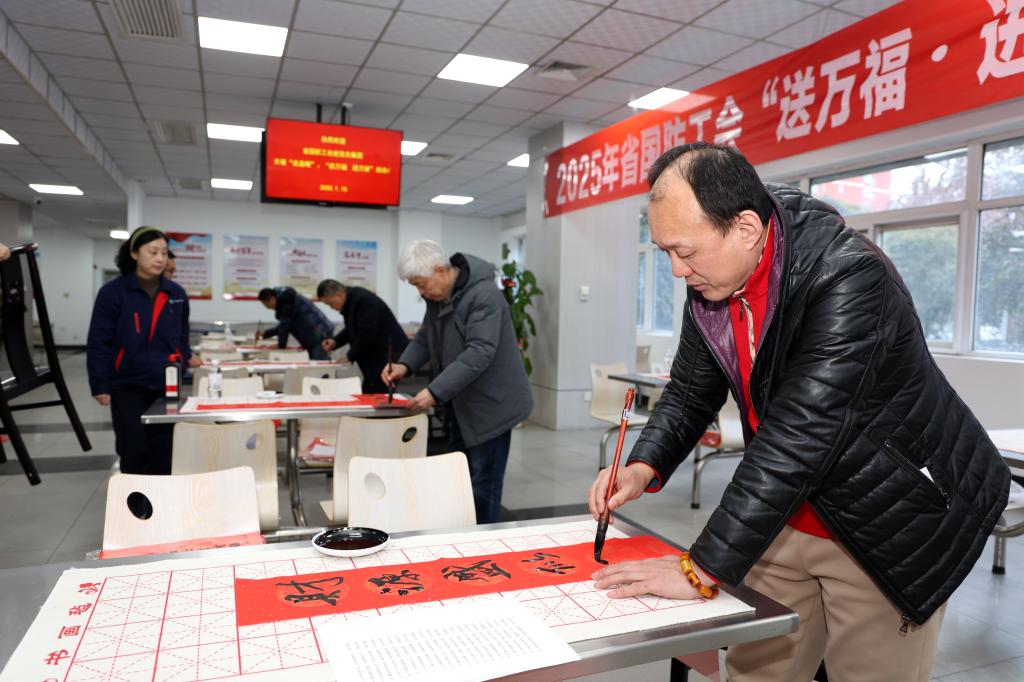 在送春聯(lián)現(xiàn)場,書法家們揮毫潑墨、筆走龍蛇,聞訊而來的職工紛紛圍在書桌旁期待成品。一停一頓、一起一落,一句句散發(fā)著清新墨香的吉祥語句躍然紙上,“一元二氣三陽泰,四時五福六合春”“春滿乾坤千里秀,時逢盛世萬家興”,一副副滿載美好祝福的春聯(lián)和“?!弊周S然紙上,既有辭舊迎新的熱切祈盼,也有對幸福生活的美好祝福。職工們拿到寫滿祝福和美好祝愿的春聯(lián),喜悅之情溢于言表?;顒悠陂g共送出春聯(lián)近400余幅,福字300余幅。