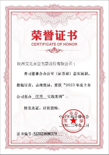 自寶光股份上市以來,董事會與管理層高度重視各項工作,董辦團隊切實關(guān)注各項履職能力提升,堅守初心,嚴(yán)格按照法律法規(guī)開展各項工作。獲得此項榮譽充分體現(xiàn)了中國上市公司協(xié)會對寶光股份董事會辦公室信息披露管理、治理機制建設(shè)、投資者關(guān)系管理、相關(guān)制度制定修訂、ESG管理披露、監(jiān)督培訓(xùn)等各項工作成果的高度認(rèn)可和充分肯定。