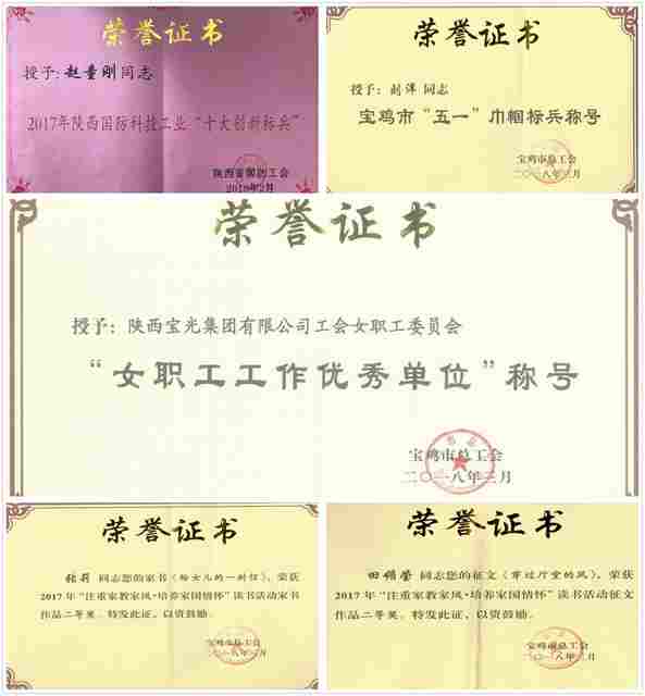 寶光集團(tuán)女工委榮獲寶雞市總工會女職工工作優(yōu)秀單位;精密陶瓷公司趙童剛同志榮獲陜西省國防科技工業(yè)“十大”創(chuàng)新標(biāo)兵;進(jìn)出口公司劉洋同志榮獲寶雞市“五一”巾幗標(biāo)兵;C產(chǎn)品制造部田媚瑩同志在寶雞市“注重家教家風(fēng) 培養(yǎng)家國情懷”讀書征文活動(dòng)中榮獲二等獎(jiǎng);A產(chǎn)品制造部張莉同志在寶雞市讀書活動(dòng)中榮獲家書作品二等獎(jiǎng)。