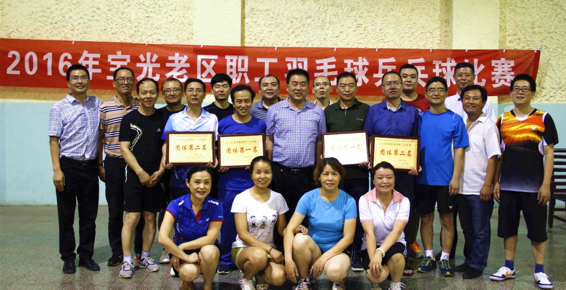 比賽活動得到老區(qū)各單位的大力支持,職工參與熱情高漲,比賽在工會副主席姜萬宏宣布比賽規(guī)則后拉開帷幕。賽場上氣氛緊張而熱烈,各參賽隊隊員精神飽滿、戰(zhàn)術(shù)靈活,渾汗如雨,比賽場面精彩不斷……經(jīng)過近4個小時的激烈角逐,氣體公司分別獲得羽毛球和乒乓球團(tuán)體賽第一名,動力部獲得羽毛球團(tuán)體賽第二名,電子玻璃廠獲得乒乓球團(tuán)體賽第二名,其他參賽隊獲得優(yōu)秀獎。賽后,參賽隊員進(jìn)行了合影留念。