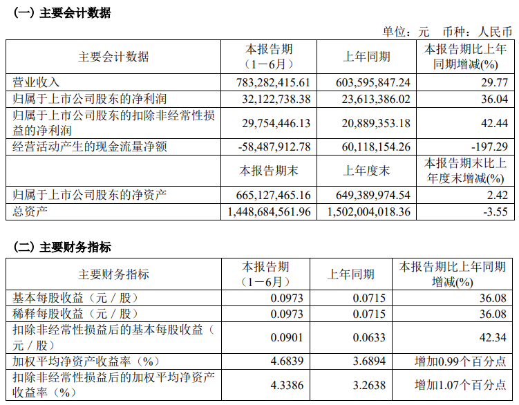 寶光股份2023年半年度主要財(cái)務(wù)指標(biāo)