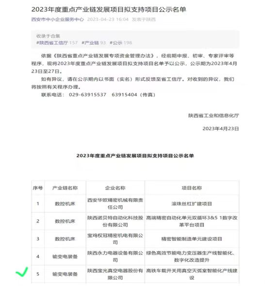 通過(guò)認(rèn)真籌備、資料審核及現(xiàn)場(chǎng)答辯,由公司組織申報(bào)的“72.5kV、126kV及以上高電壓等級(jí)真空滅弧室產(chǎn)品研發(fā)及產(chǎn)業(yè)化”項(xiàng)目與“高鐵車(chē)載開(kāi)關(guān)用真空滅弧室智能化產(chǎn)線(xiàn)建設(shè)”項(xiàng)目分別中榜陜西省工信廳2023年關(guān)鍵核心技術(shù)產(chǎn)業(yè)化“揭榜掛帥”項(xiàng)目與重點(diǎn)產(chǎn)業(yè)鏈發(fā)展項(xiàng)目,并已進(jìn)入公示階段。